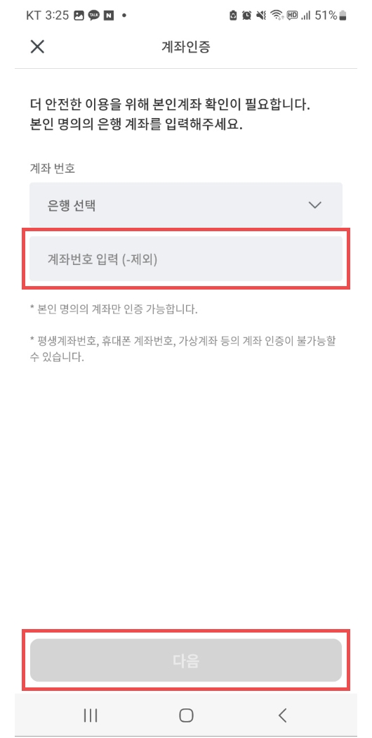 5. 본인 명의의 은행과 은행계좌번호를 입력합니다. 대부분의 공공기관 인증에서 사용가능하기 때문에 정확한 본인 확인을 위해 계좌확인은 필수 입니다.
