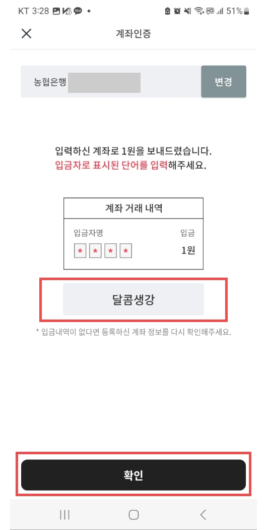 6. 계좌 인증을 위해 입력하신 계좌로 1원이 입금됩니다. 계좌로 들어가보시면 1원이 입금되어있고 입금자명이 있는데, 확인하고 적어주시면 됩니다.