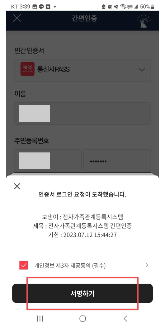 3. 인증서 로그인 요청이 도착했습니다. 라고 나옵니다. 서명하기를 누릅니다.
