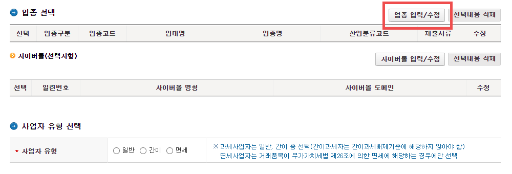 5. 업종 선택 입니다. 예전에는 해외직구대행업의 코드를 찾아보고 입력해서 번거로움이 있었는데요. 지금은 업종 입력/수정에만 들어가면 해외직구대행업이 있습니다. 그리고 사이버몰 입력의 경우 아직 스마트스토어 등을 개설하지 않았으면 입력하지 않으셔도 무방합니다.