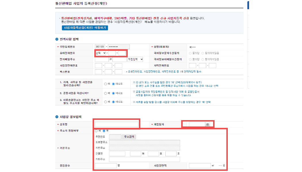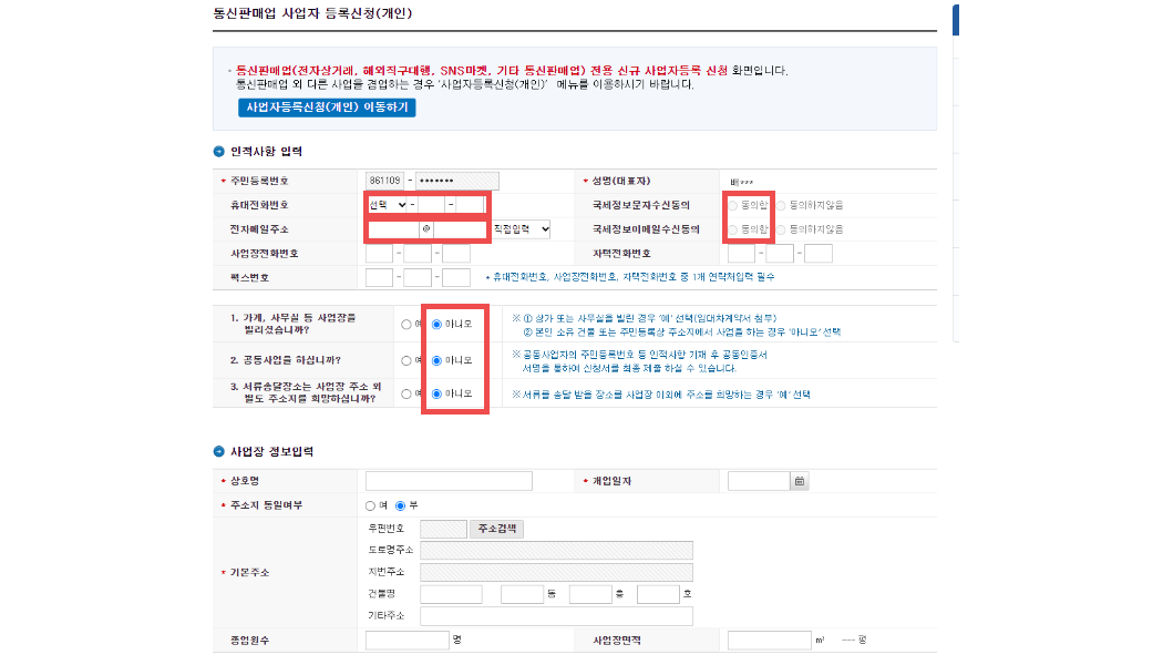 3. 인적사항을 입력합니다. 나중에 세금 관련한 문자가 발송되므로 국세정보문자수신동의 합니다. 휴대전화번호만 적으셔도 됩니다.