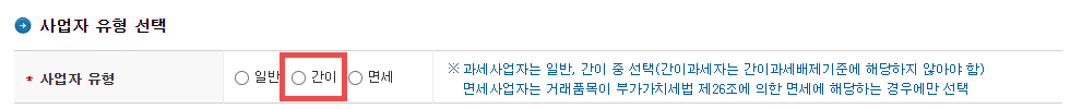 7. 사업자 유형 선택 입니다. (간이)로 선택 합니다. 연매출 8000만원 미만은 간이로 선택하시면 됩니다.