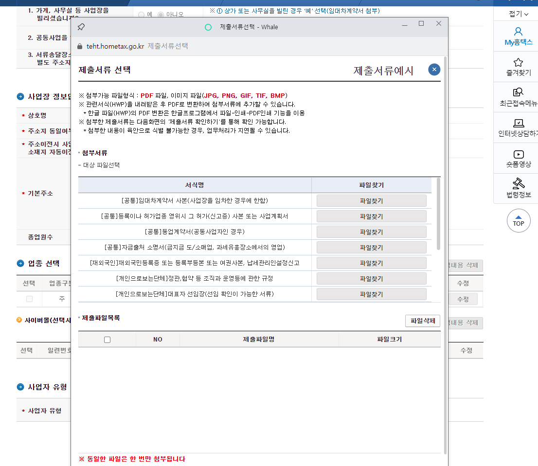 8. 저장 후 다음으로 넘어가게 되면 제출서류 선택이 나옵니다. 첫번째 [공통]임대차계약서 사본만 고려하면 됩니다. 본인 거주지의 본인 명의로 된 곳을 사업장으로 지정 했다면 그냥 넘기시면 됩니다. 하지만 부모님 명의 또는 친구집 명의의 집을 입력했다면 무상임대차계약서를 작성해야 하고, 비상주 임대차계약을 하신 분들은 임대차 계약서를 첨부해야 합니다. 나머지는 첨부할 필요 없습니다.