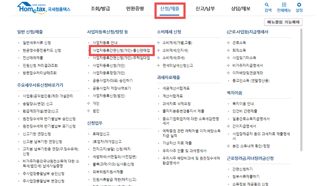2. 홈페이지 상단에 신청/제출 - 사업자등록간편신청(개인) 통신판매업을 클릭합니다.
